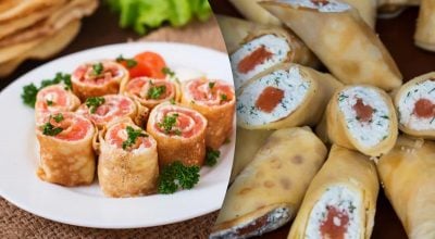 Po ostygnięciu naleśnika zdejmujemy pergamin, smarujemy go serkiem śmietankowym, układamy plasterki czerwonej ryby i całość zwijamy.